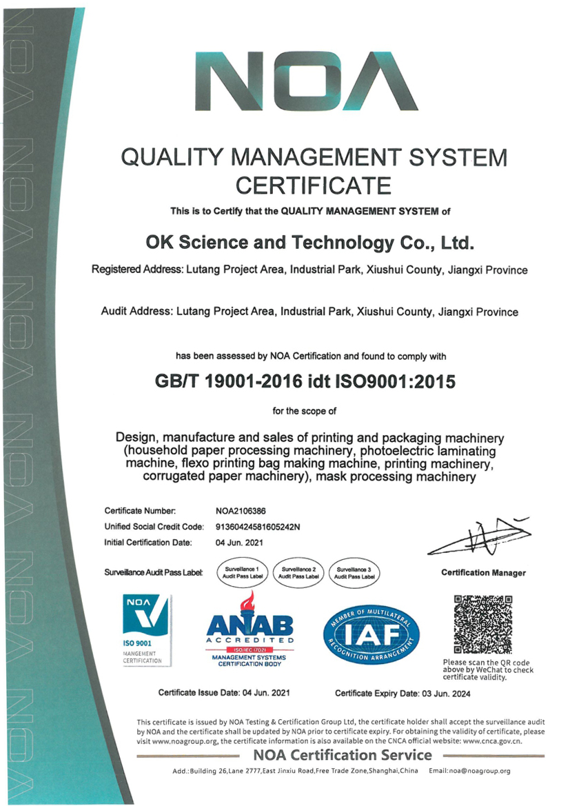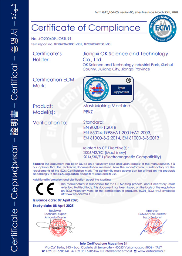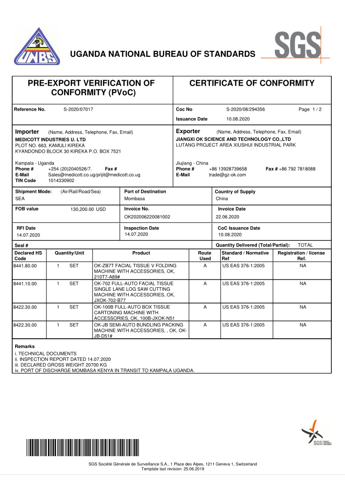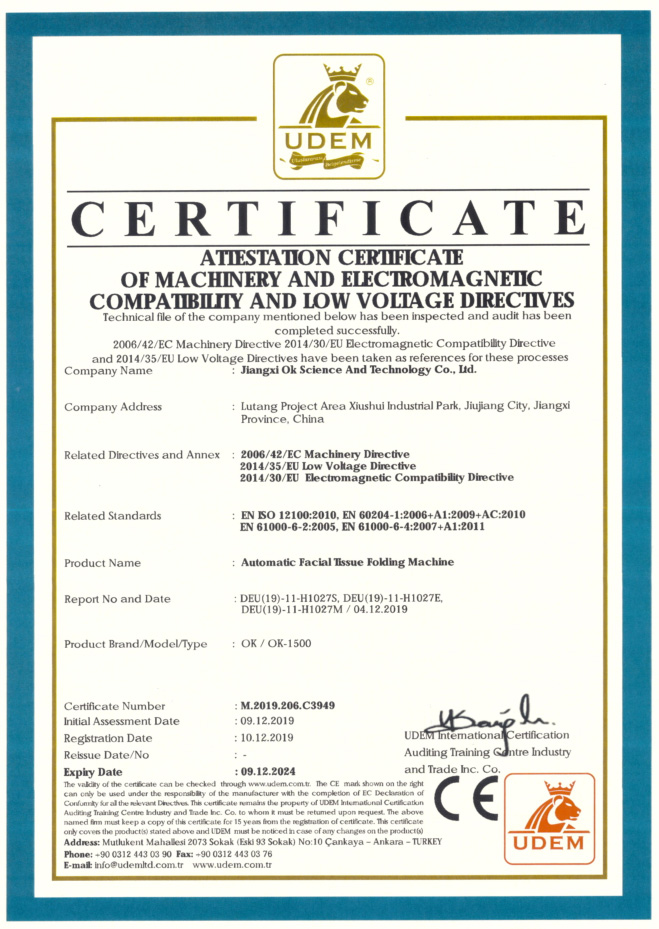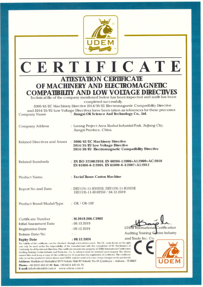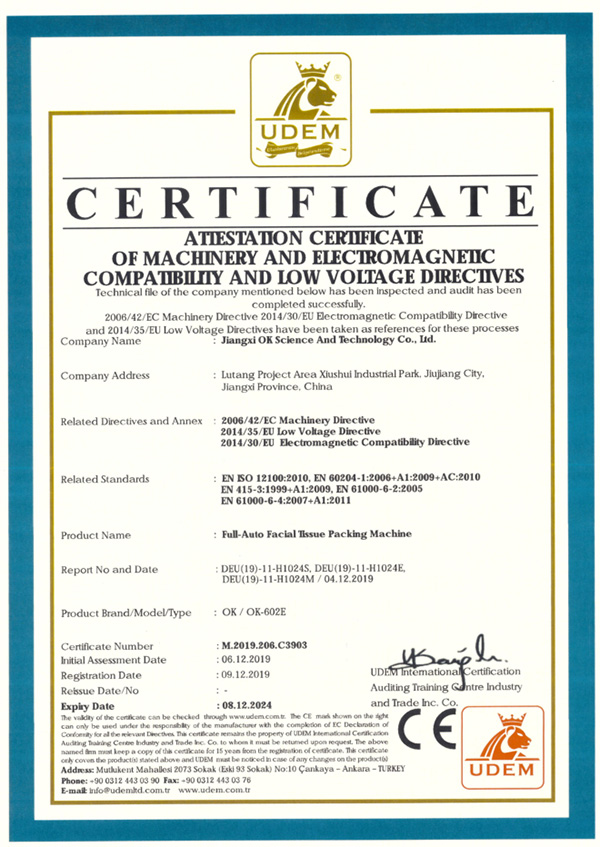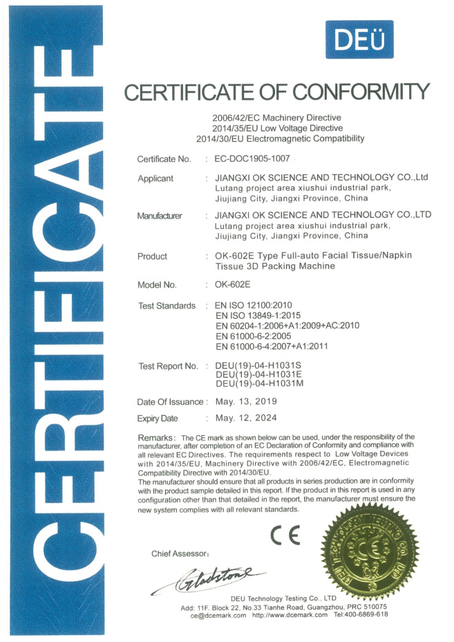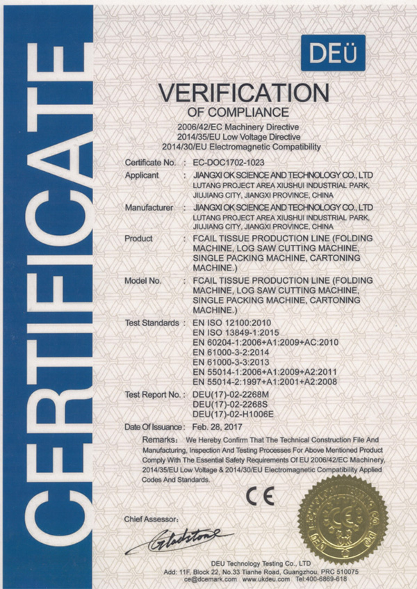 Facial Tissue Production Line CE ISO9001 OK-102 Case Packer CE Certificate OK-602E Facial Tissue Single Packing Machine CE Certificate Ok-602e Facial Tissue Single Packing Machine Ce Certificate OK-702 Log Saw Cutting Machine CE Certificate OK-1500 Automatic Facial Tissue Folding Machine CE Certificate Pre-Export Verification Of Conformity Pre-Export Verification Of Conformity Mask Machine CE